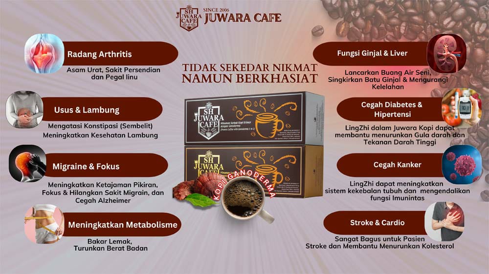 Inilah Yang Menjadi pembeda SH JUWARA CAFE dengan Kopi instant lainnya, kandungan Yung Kien Ganoderma mampu memberi dampak kesehatan yang optimal, selain citarasa kopi yang nikmat anda tetap mendapatkan nutrisi penting untuk tetap menjaga kebugaran dan kesehatan serta melindungi organ-organ tubuh tetap sehat